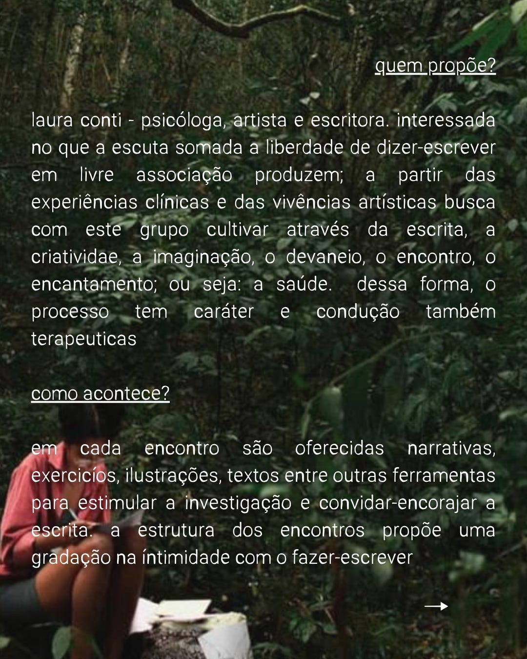 A cada encontro, são oferecidas narrativas e imagens como ferramentas de convocação para que o íntimo se manifeste em palavra-texto.